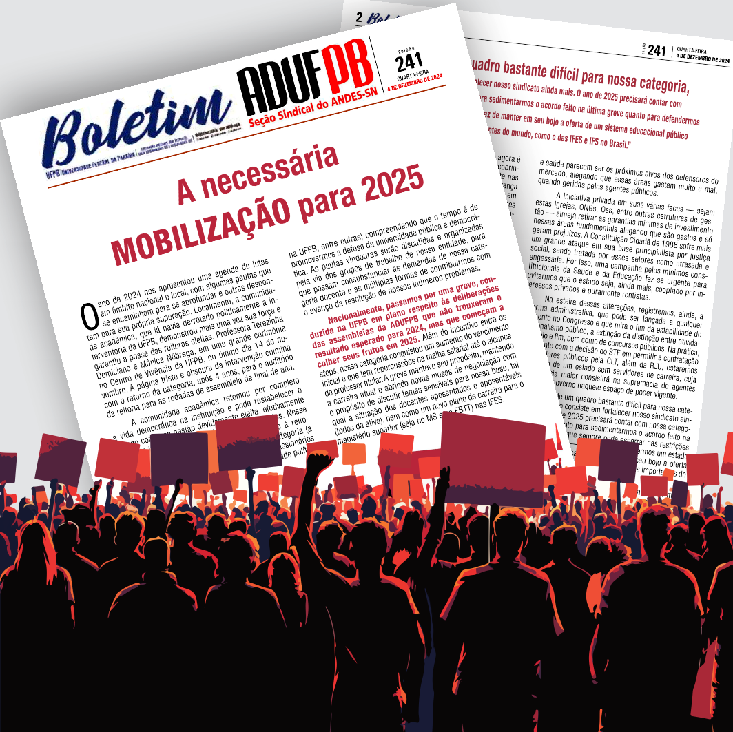 O ano de 2024 nos apresentou uma agenda de lutas em âmbito nacional e local, com algumas pautas que se encaminham para se aprofundar e outras despontam para sua própria superação. Localmente, a comunidade acadêmica, que já havia derrotado politicamente a interventoria da UFPB, demonstrou mais uma vez sua força e garantiu a posse das reitoras eleitas, Professora Terezinha Domiciano e Mônica Nóbrega, em uma grande cerimônia no Centro de Vivência da UFPB, no último dia 14 de novembro. A página triste e obscura da intervenção culmina com o retorno da categoria, após 4 anos, para o auditório da reitoria para as rodadas de assembleia de final de ano.