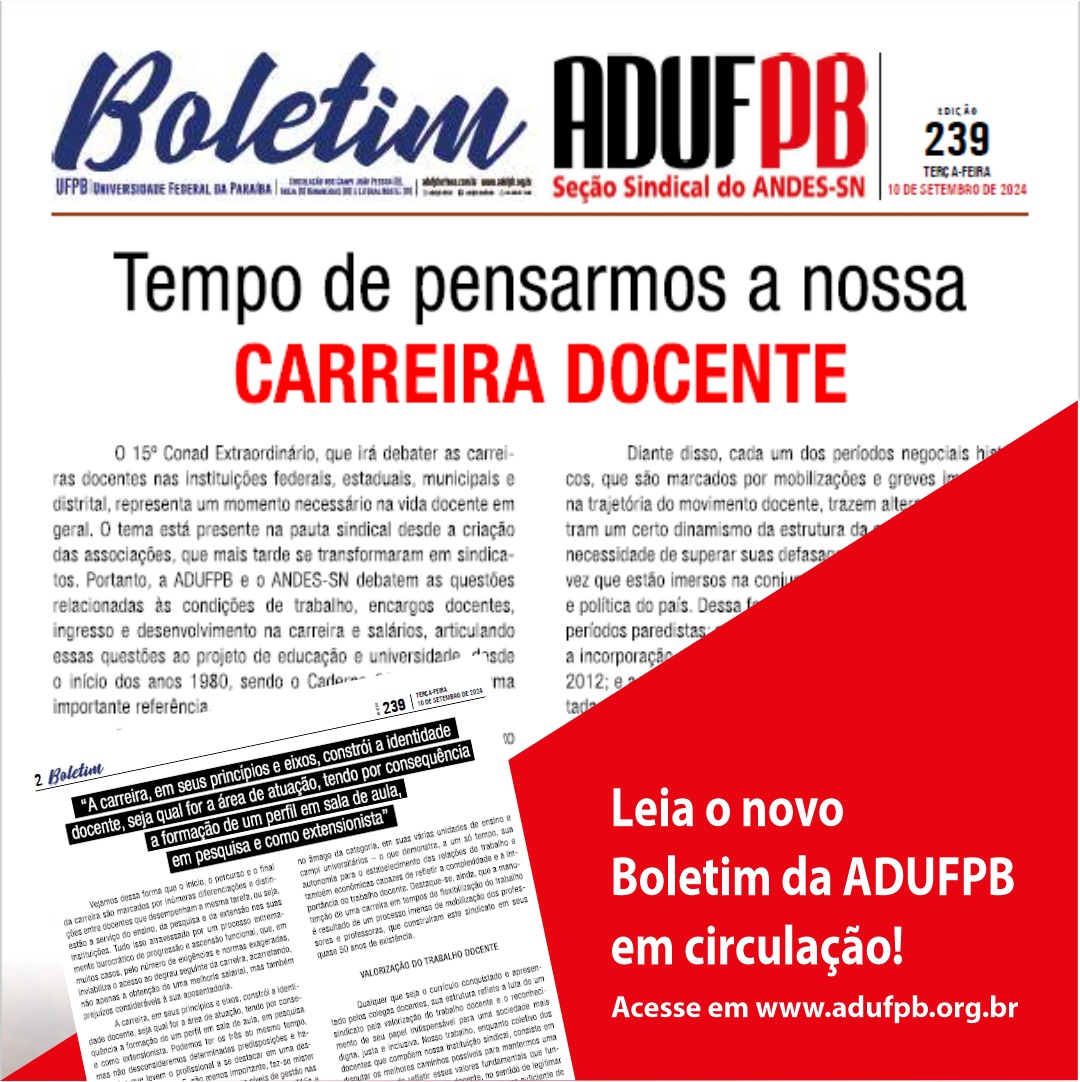 Já está disponível a nova edição do Boletim ADUFPB, que aborda o tema central do 15º Conad Extraordinário: a carreira docente. O documento enfatiza a necessidade de debater as condições de trabalho nas instituições de ensino superior, articulando-as às demandas históricas da categoria.