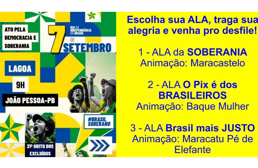 O Centro de João Pessoa será ocupado neste domingo (7) pela 31ª edição do Grito dos Excluídos e das Excluídas. O evento, que acontece no dia 7 de setembro como uma contraposição do “grito de Independência”, conta, este ano, com a participação do Movimento pela Soberania e Democracia para defender a soberania do país e enfrentar os ataques do imperialismo americano.