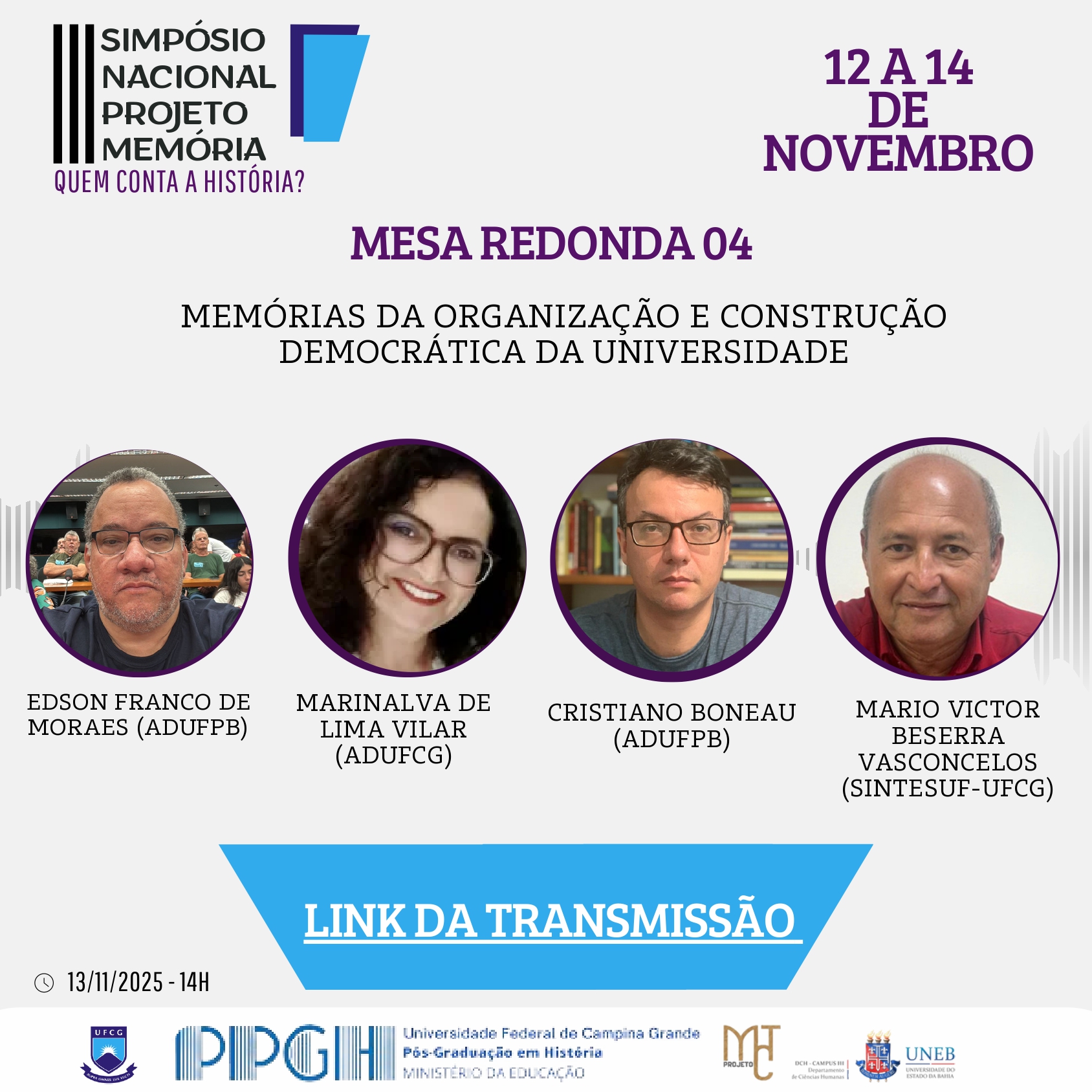 Em sua terceira edição, o Simpósio Nacional Projeto Memória destaca o tema “Quem conta a História? A Memória no contexto da disputa pela Democracia”. O evento começou nesta quarta-feira (12) e segue até sexta-feira (14), com atividades no campus Campina Grande da UFCG e transmissão online.
