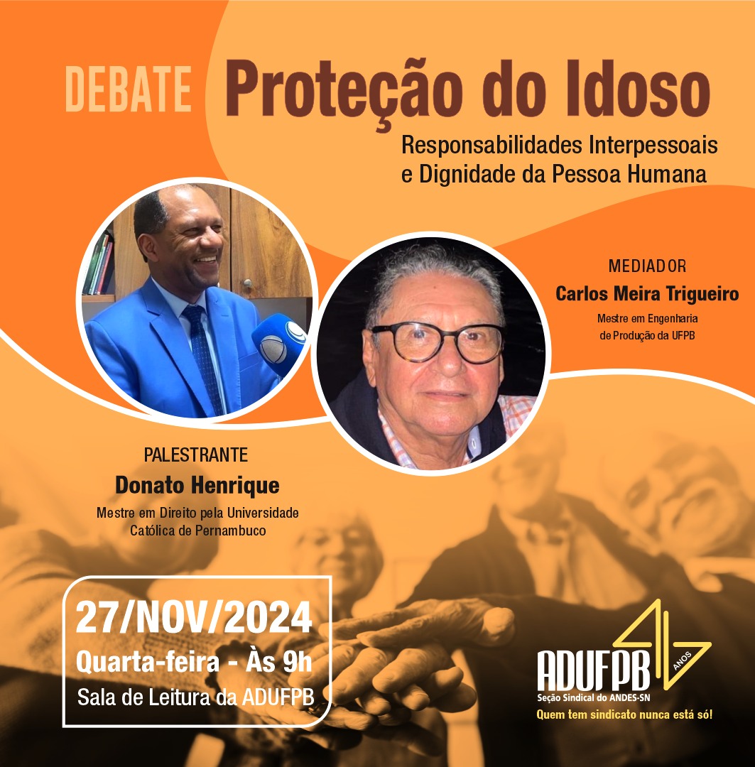 A ADUFPB realiza, na próxima quarta-feira (27), um evento voltado à discussão sobre os direitos e deveres da população idosa. Com o tema “Proteção do Idoso: Responsabilidades Interpessoais e Dignidade da Pessoa Humana”, o encontro ocorrerá das 9h às 11h30, na Sala de Leitura da sede da ADUFPB, localizada no Centro de Vivência do campus I, em João Pessoa.