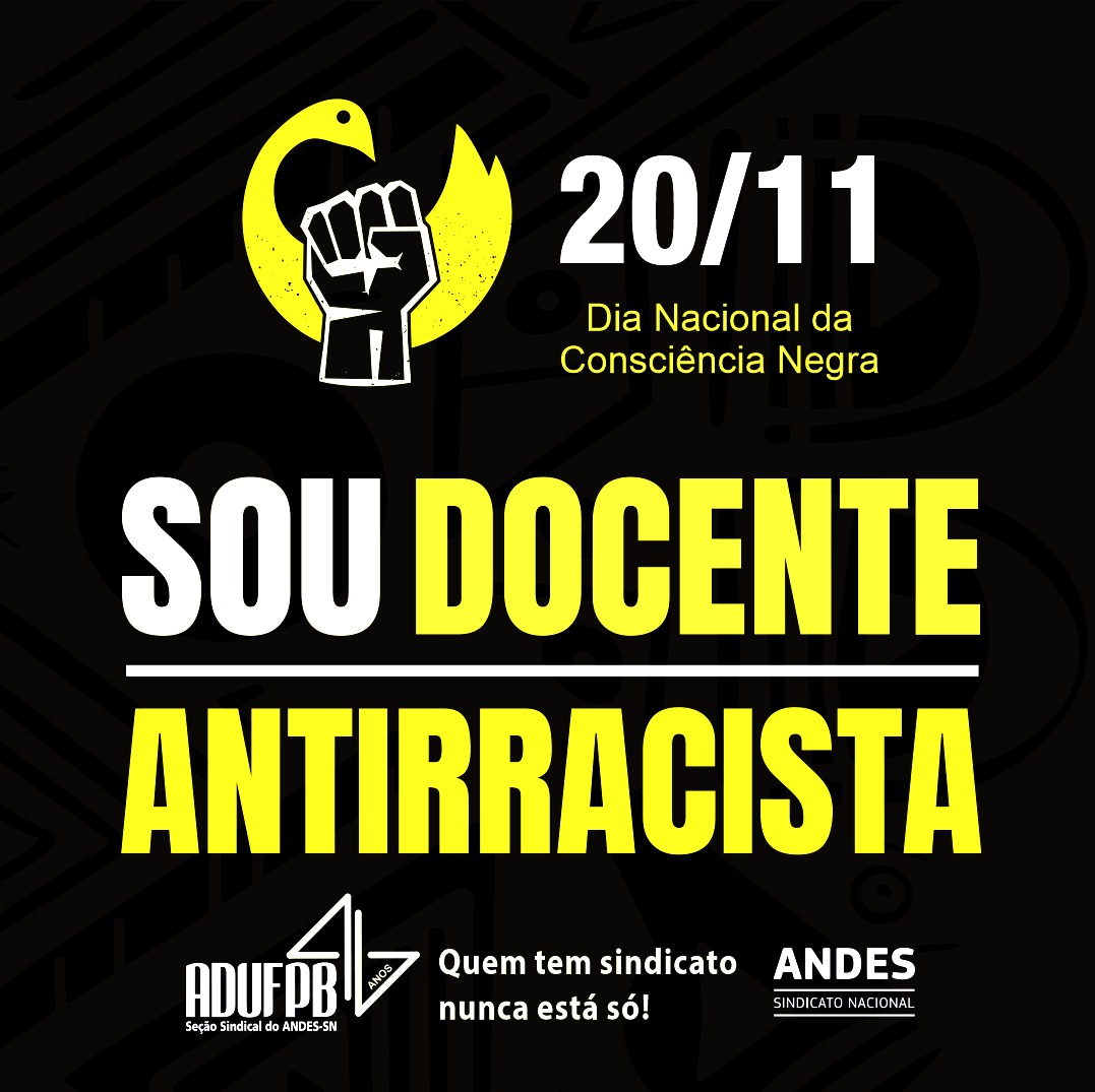 Neste dia 20 de novembro — Dia Nacional da Consciência Negra, a ADUFPB vem reafirmar o seu compromisso político, social e de trabalho, com uma vasta agenda de lutas em defesa da promoção de uma educação antirracista, no combate ao racismo e na valorização das culturas africanas e afro-brasileiras.