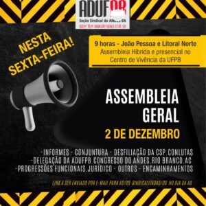 Presencialmente, a assembleia ocorrerá no Centro de Vivência do campus I, em João Pessoa, contando com a participação de professoras e professores também pelo Zoom. Um telão será instalado no local para que participantes virtuais possam fazer suas falas. O link será encaminhado horas antes por e-mail (adufpb@terra.com.br) e Whatsapp (83.99645-7000).