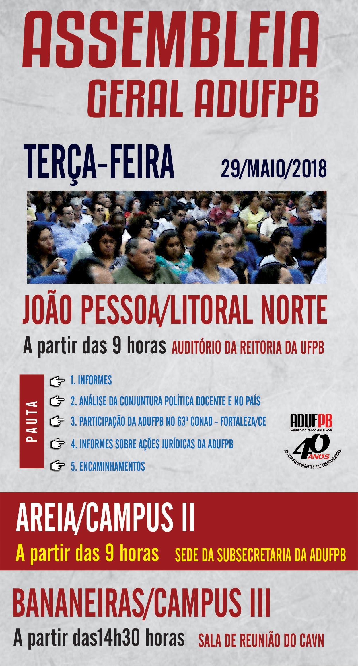 Em João Pessoa a Assembleia Geral da ADUFPB acontece no Auditório da Reitoria, Campus I, a partir das 9 horas, conjuntamente com a reunião dos docentes do Campus IV, Litoral Norte.