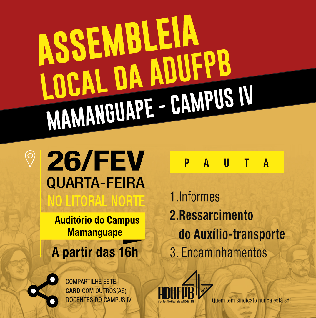 A ADUFPB convoca os docentes da UFPB do Campus IV (Mamanguape e Rio Tinto) para participarem da Assembleia Local que acontecerá nesta quarta-feira, 26 de fevereiro, às 16h, no Auditório da unidade de Mamanguape. A atividade contará com a presença da assessoria jurídica do sindicato.