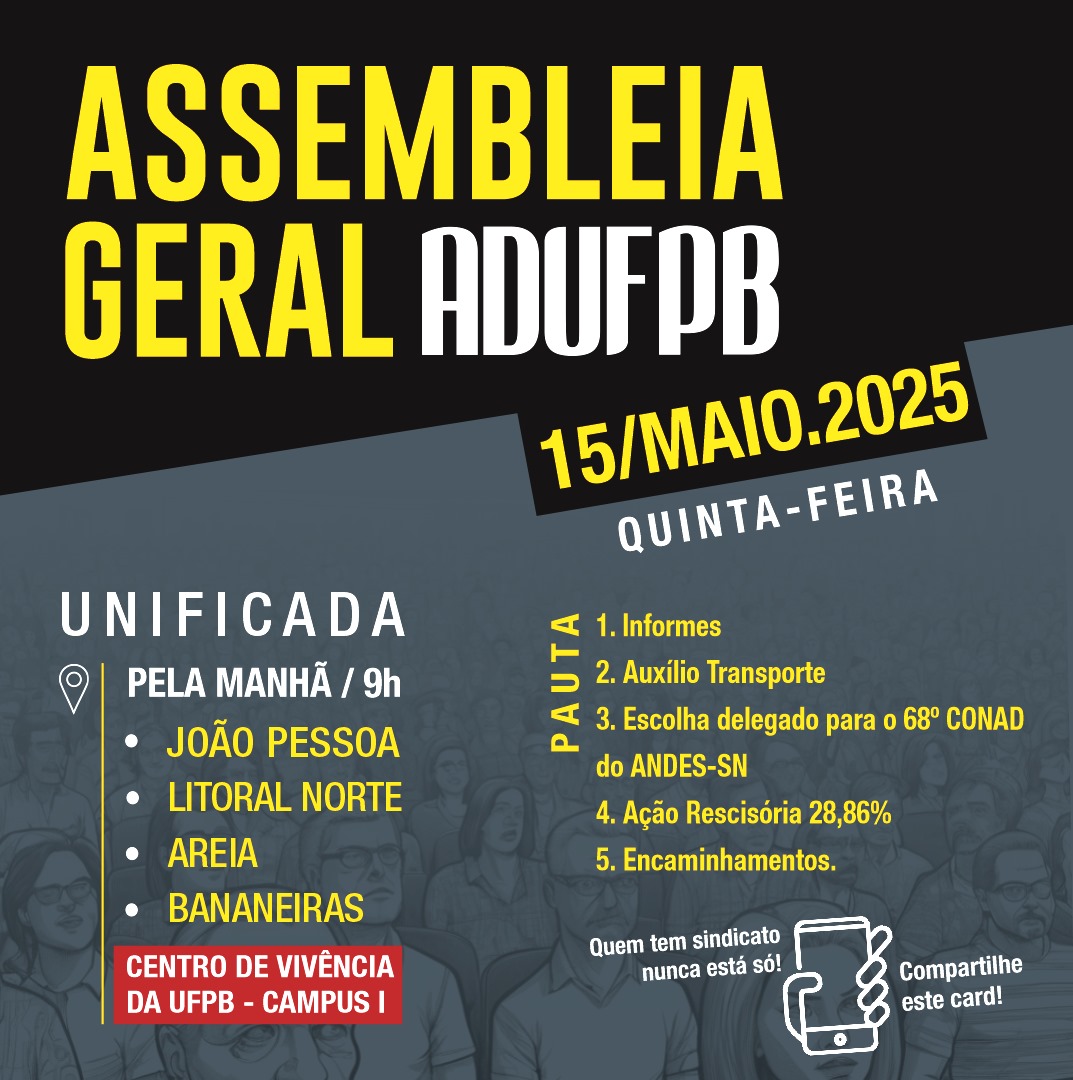 A ADUFPB convoca toda a categoria a participar, na quinta-feira (15), da Assembleia Geral unificada que acontecerá no Centro de Vivência do campus I da UFPB, em João Pessoa. A atividade começará às 9h e reunirá os(as) docentes dos quatro campi da UFPB.