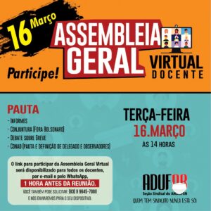 Os professores da UFPB reúnem-se em assembleia na próxima terça-feira, dia 16 de março. A atividade será realizada a partir das 14h por videoconferência, por meio da plataforma Zoom. Os docentes receberão o link pelo e-mail adufpb@terra.com.br ou pelo Whatsapp 9.9645-7000.