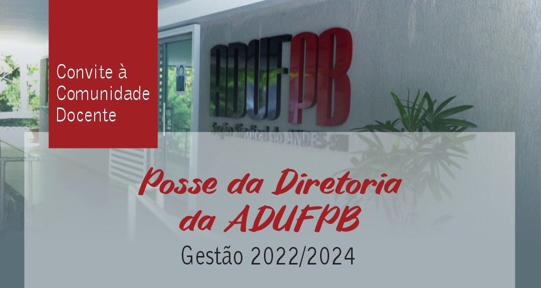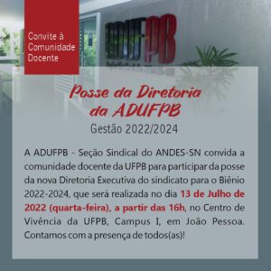 Será nesta quarta-feira, dia 13 de julho, a cerimônia de oficialização de posse da nova Diretoria Executiva da ADUFPB, biênio 2022/2024. O evento ocorrerá no Centro de Vivência do campus I, a partir das 16h, com a presença de autoridades, parlamentares, movimentos sociais e representantes de todos os segmentos da UFPB.