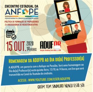 A ADUFPB, em parceria com a Associação Nacional pela Formação dos Profissionais da Educação (Anfope) na Paraíba, fará uma homenagem ao Dia do(a) Professor(a) nesta quinta-feira (15/10), às 14 horas, em live no canal de Youtube do sindicato (www.youtube.com/ADUFPB). O evento fará parte do Encontro Estadual da Anfope, que este ano acontece de forma online e tem como tema a “Política de formação de professores e a necessidade de resistência ativa”. A saudação da ADUFPB aos docentes contará com a participação do presidente da entidade, Fernando Cunha, e da professora Rita Porto, Diretora de Política Educacional e Científica do sindicato.
