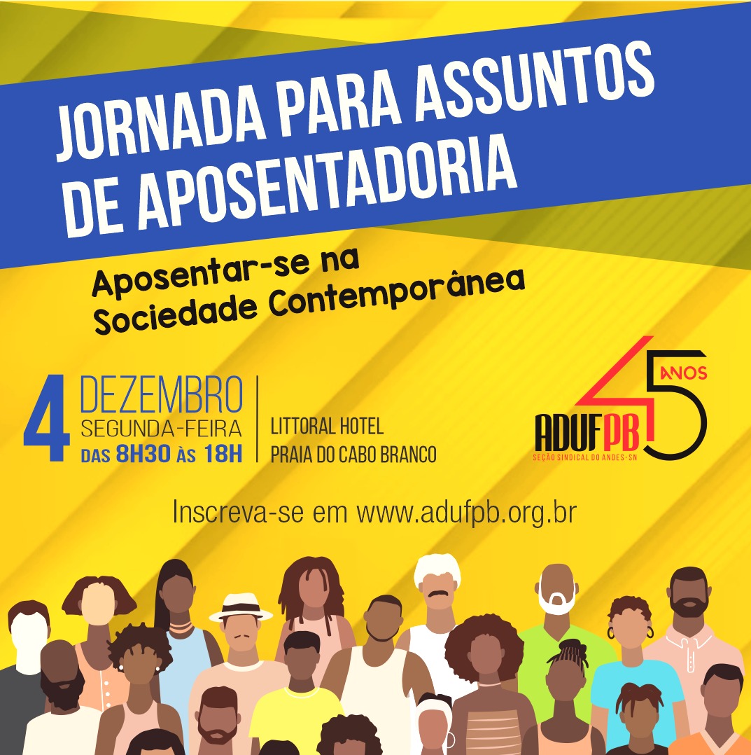 No dia 4 de dezembro, uma segunda-feira, a ADUFPB promoverá a Jornada para Assuntos de Aposentadoria: Aposentar-se na Sociedade Contemporânea. O evento acontecerá no Littoral Hotel, localizado na orla de Cabo Branco, a partir das 8h30. Constará de mesas-redondas e palestras, que se estenderão até o final da tarde.