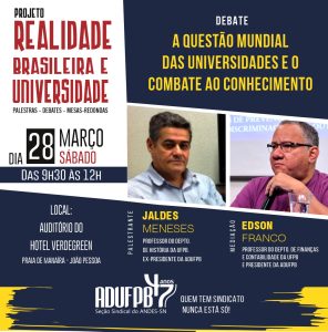 A atividade abordará o tema “A questão mundial das universidades e o combate ao conhecimento” e será realizado no Hotel Verdegreen, em João Pessoa, das 9h30 ao meio-dia. Na mesa, estará o professor do Departamento de História e ex-presidente da ADUFPB, Jaldes Reis de Meneses, e a mediação ficará a cargo do presidente da ADUFPB, professor Edson Franco.