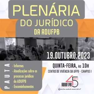 A ADUFPB realiza na próxima quinta-feira (19/10) mais uma atividade para informar e tirar dúvidas dos(as) docentes sindicalizados(as) a respeito de assuntos jurídicos. A ação terá o formato de uma plenária aberta e ocorrerá no Centro de Vivência do campus I, em João Pessoa, a partir das 10h, com a participação da assessoria jurídica do sindicato.