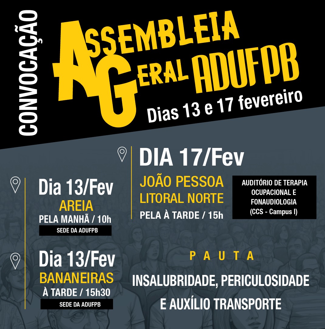 As assembleias acontecerão no dia 13 de fevereiro, às 10h, na sede da secretaria da ADUFPB em Areia, e às 15h30, na sede de Bananeiras. Já no dia 17 de fevereiro, a reunião será realizada em João Pessoa, abrangendo também o Litoral Norte, a partir das 15h, no Auditório de Fonoaudiologia do Centro de Ciências da Saúde (CCS). A ADUFPB reforça a importância da presença dos docentes nesses encontros para contribuir com o debate e fortalecer as decisões coletivas da categoria.