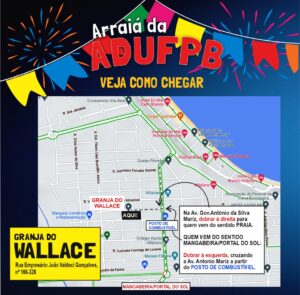 Como chegar — O Arraiá da ADUFPB vai acontecer na Granja do Wallace, um espaço de eventos amplo e descontraído, localizado no bairro Portal do Sol, em João Pessoa. Para quem estiver saindo de bairros como Cabo Branco, Tambaú, Manaíra, Bessa, Bairro dos Estados e imediações, o melhor caminho é pelo Altiplano. Basta pegar a avenida principal (João Cirilo da Silva) e seguir em direção à Estação Ciência/Farol do Cabo Branco. No terceiro girador, entrar à direita, na Avenida Governador Antônio da Silva Mariz, e seguir em frente. Após aproximadamente 500 metros, entrar à direita na Rua Empresário João Valdeci Gonçalves. A entrada da Granja fica cerca de 270 metros depois.