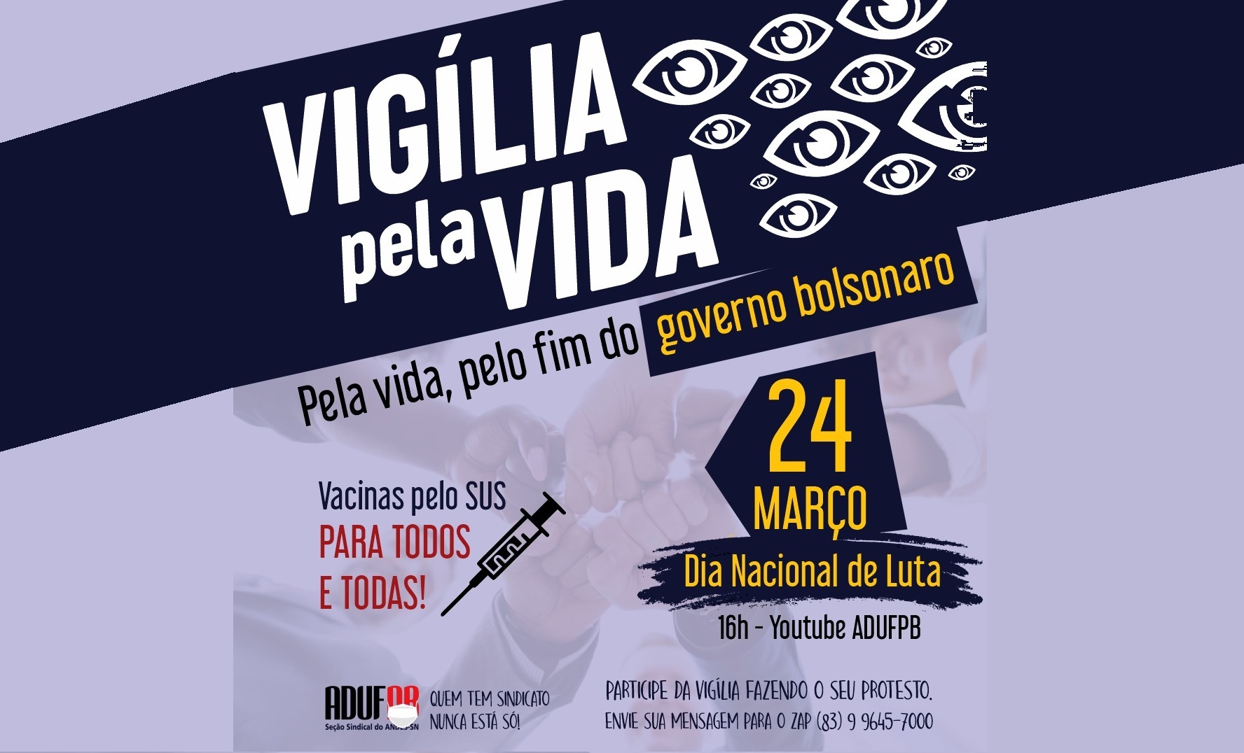 “De luto pelas mortes. Em luta pela vida e contra o genocídio”. É com essa premissa que a ADUFPB realiza nesta quarta-feira, 24 de março, a “Vigília pela Vida”, atividade que integra a programação do Dia Nacional de Luta, Mobilizações, Paralisação e Greve do Funcionalismo Público.