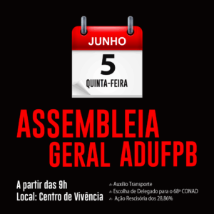 A ADUFPB realizará na próxima quinta-feira (5/6), uma Assembleia Geral docente unificada no Centro de Vivência do campus I, a partir das 9h, com a participação de professoras e professores dos quatro campi da UFPB.