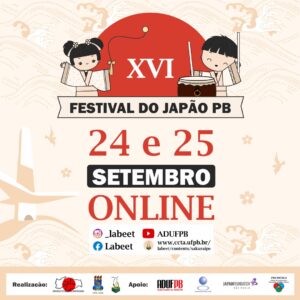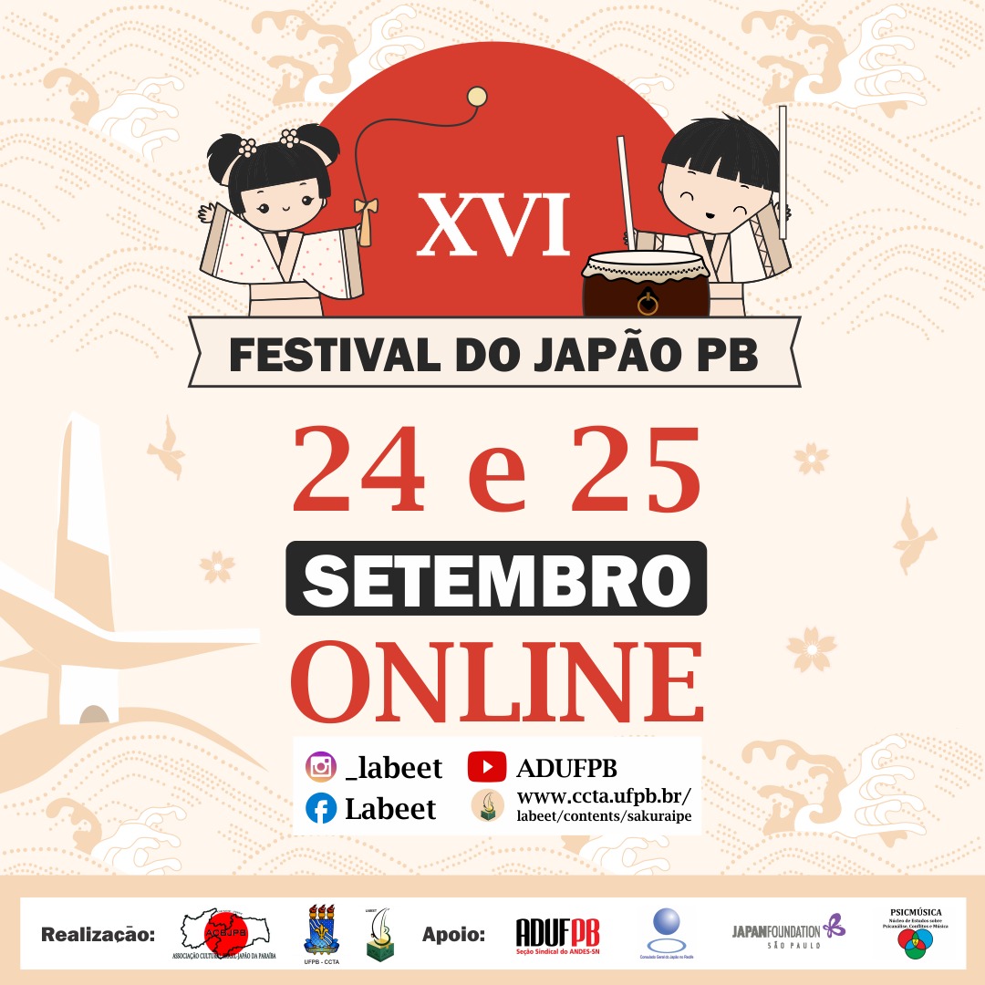 Tudo pronto para o XVI Festival da Associação Cultural Brasil- -Japão (ACBJ-PB) e o I Colóquio Internacional Cantos das Cidades: Aldeias Sonoras e Translocalidades, que acontecem nos dias 24 e 25 deste mês, dentro da Mostra Sakura-Ipê. Os eventos serão virtuais, com transmissão pelo canal da ADUFPB no YouTube.