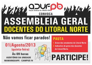 Os professores do campus IV da UFPB (Litoral Norte) realizam assembleia nesta quinta-feira (1/8) para discutir a paralisação dos estudantes do centro de ensino, que já dura duas semanas, e um indicativo de greve dos docentes. A reunião ocorrerá no auditório da unidade de Mamanguape e está marcada para começar às 9h.