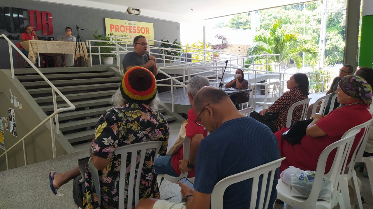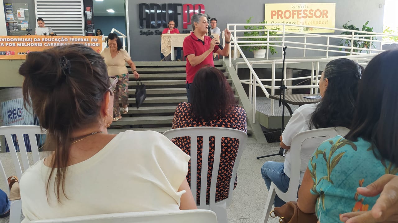 Alguns professores aproveitaram a assembleia para também apresentar informes à categoria. Um deles foi o professor Márcio Silva, do DSE/CCEN. Ele falou sobre a perseguição da gestão interventora da UFPB a professores e servidores, com tentativa de criminalizar profissionais que se manifestaram contrários à intervenção.