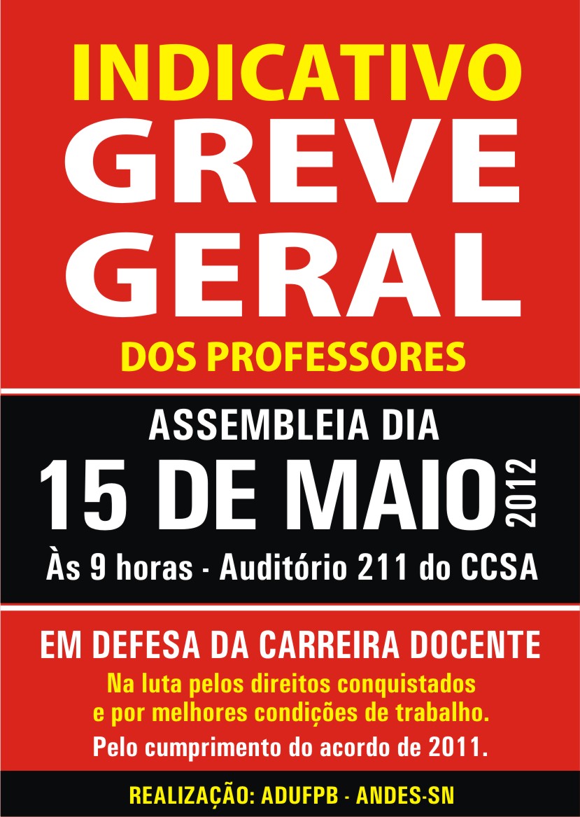 Na UFPB, a assembleia acontecerá às 9h, simultaneamente nos campi de João Pessoa (no auditório 211 do CCSA, reunindo também docentes de Santa Rita e do Litoral Norte), Areia e Bananeiras.