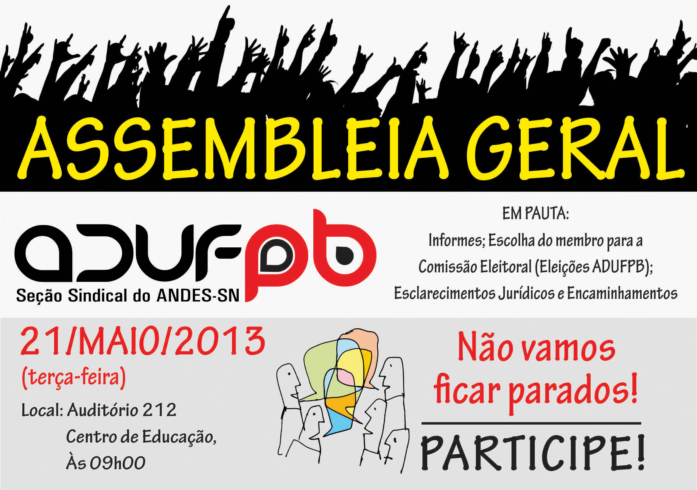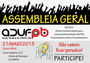 Os professores da UFPB se reúnem em assembleia geral na próxima terça-feira, 21/5. Em pauta, a escolha de membro da comissão eleitoral das eleições da ADUFPB, esclarecimentos jurídicos e financeiros e encaminhamentos.