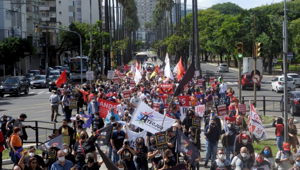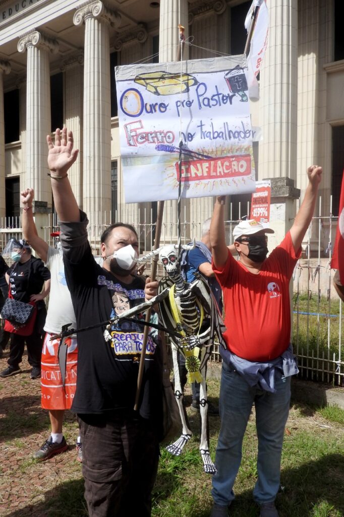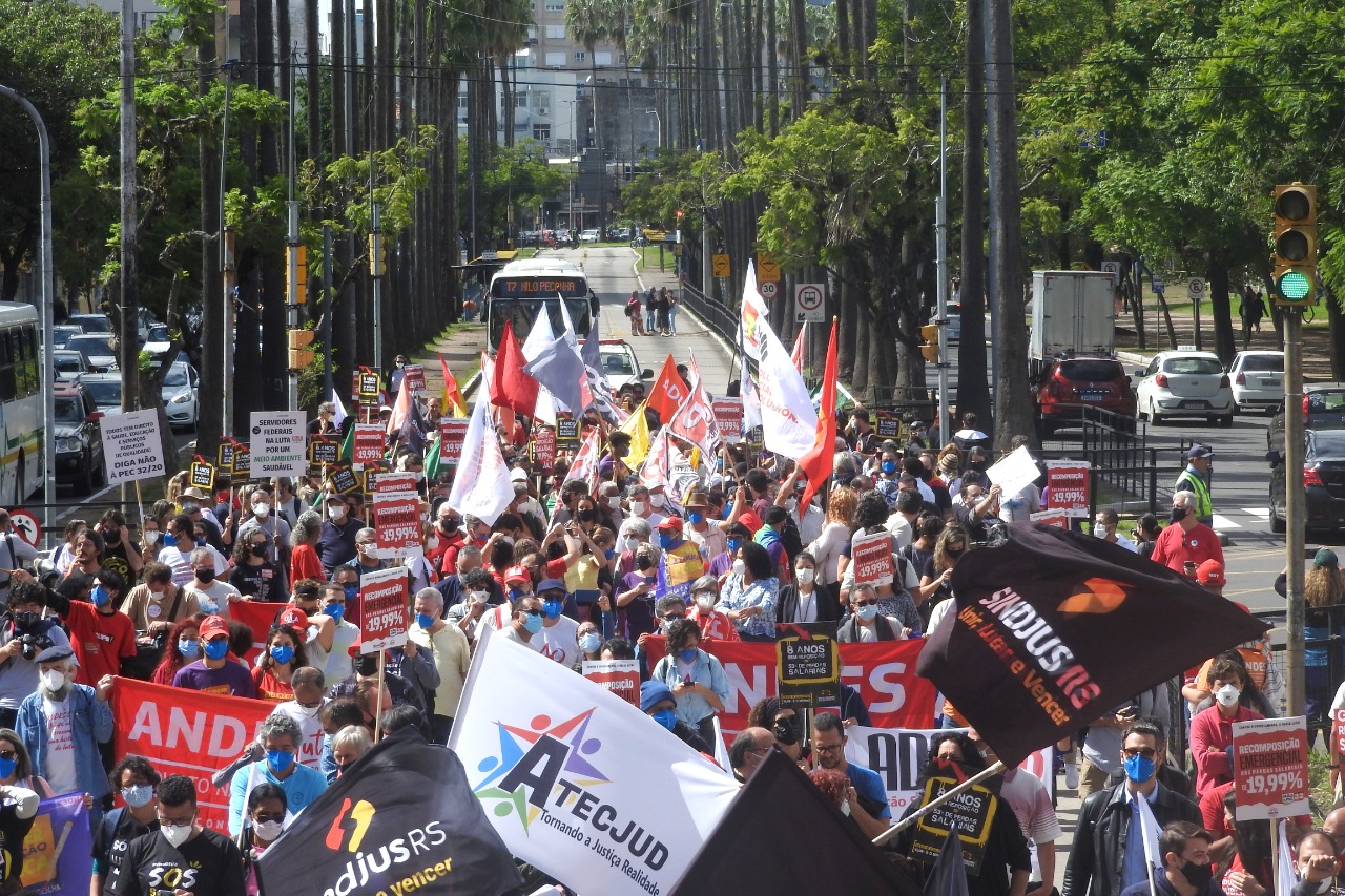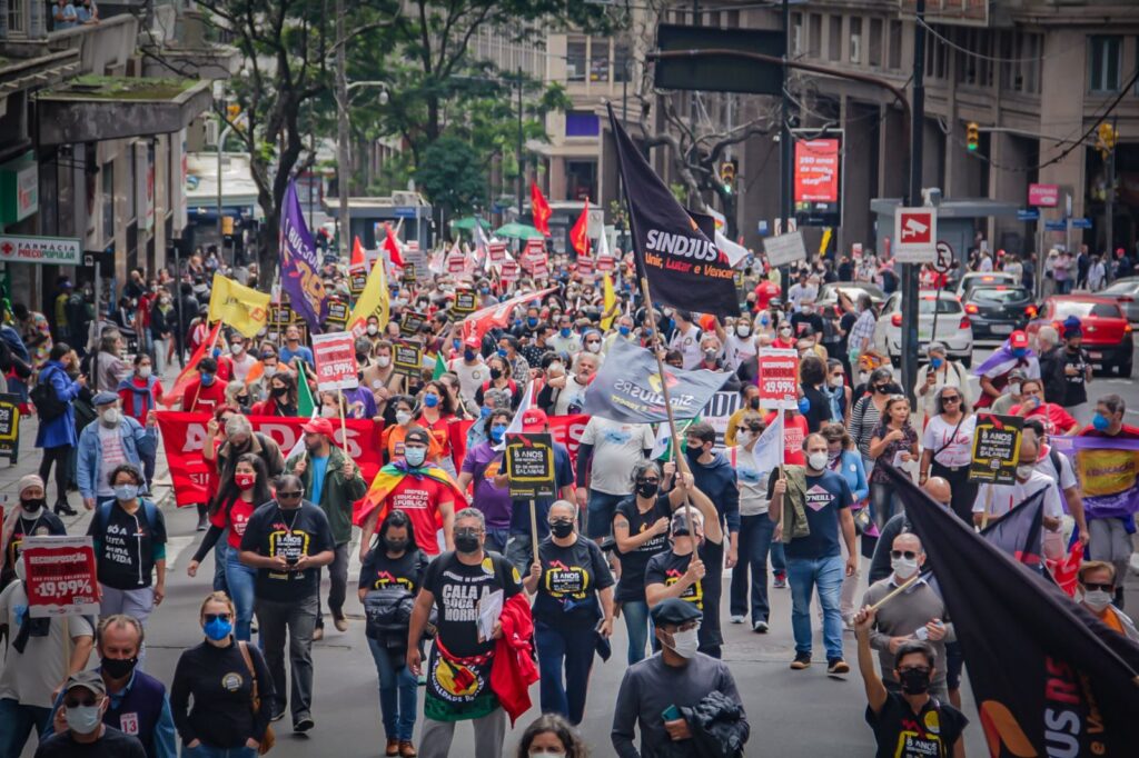Em frente ao palácio, e ao lado da Assembleia Legislativa do Estado do RS, as e os manifestantes cobraram do atual governador do Rio Grande do Sul e das e dos parlamentares estaduais a valorização das servidoras e dos servidores públicos. As e os representantes das entidades, fóruns e movimentos fizeram uma retrospectiva da luta em defesa dos serviços públicos, por reposição salarial emergencial, pela revogação imediata da Emenda Constitucional 95 – do Teto dos Gastos – e pela rejeição da Proposta de Emenda à Constituição (PEC) 32, da reforma Administrativa.