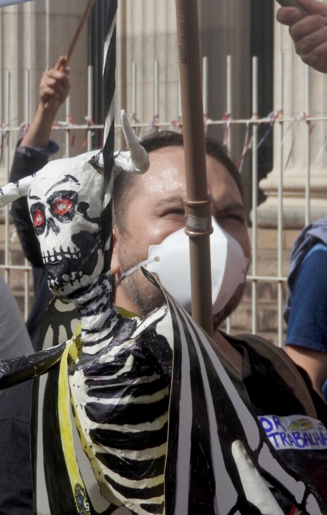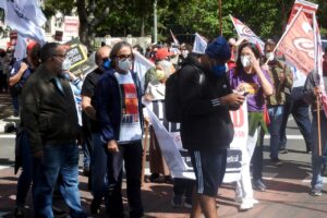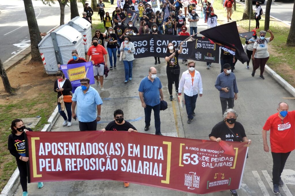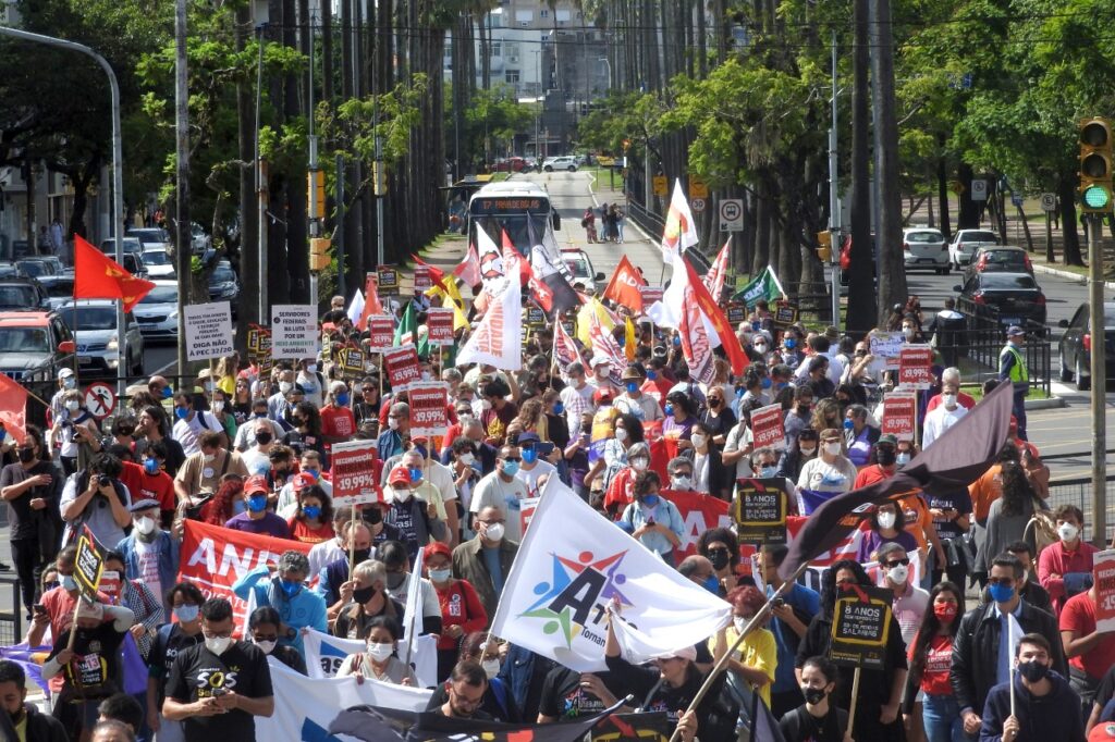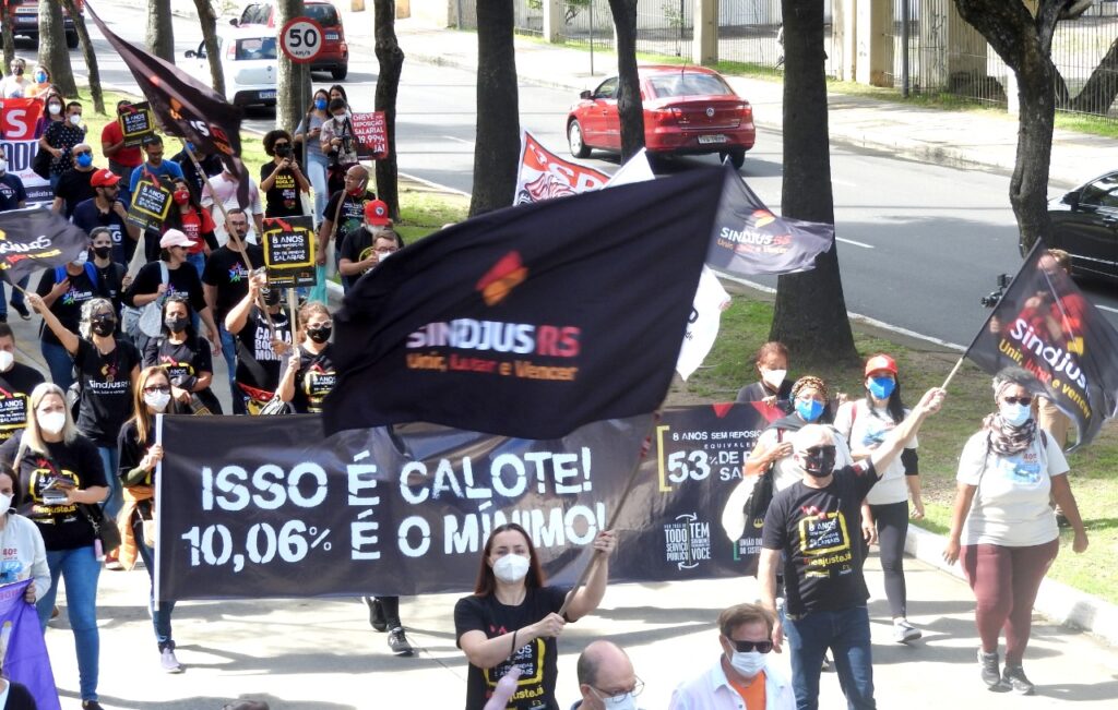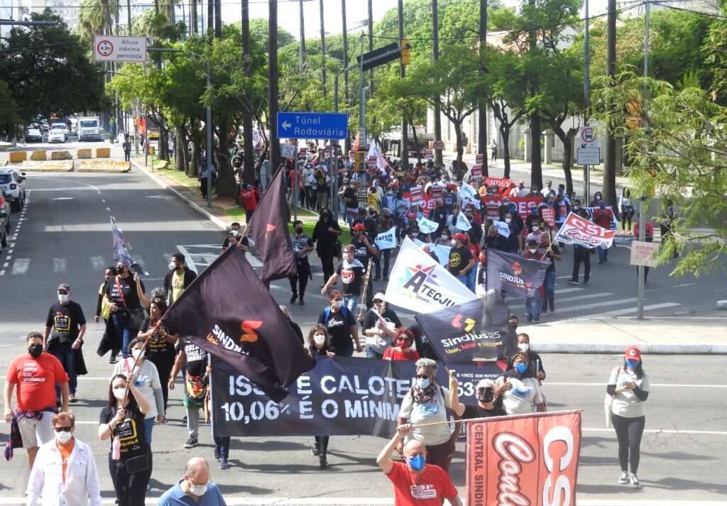 Em frente ao palácio, e ao lado da Assembleia Legislativa do Estado do RS, as e os manifestantes cobraram do atual governador do Rio Grande do Sul e das e dos parlamentares estaduais a valorização das servidoras e dos servidores públicos. As e os representantes das entidades, fóruns e movimentos fizeram uma retrospectiva da luta em defesa dos serviços públicos, por reposição salarial emergencial, pela revogação imediata da Emenda Constitucional 95 – do Teto dos Gastos – e pela rejeição da Proposta de Emenda à Constituição (PEC) 32, da reforma Administrativa.