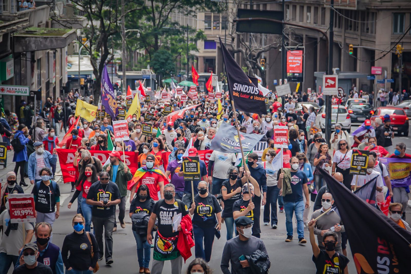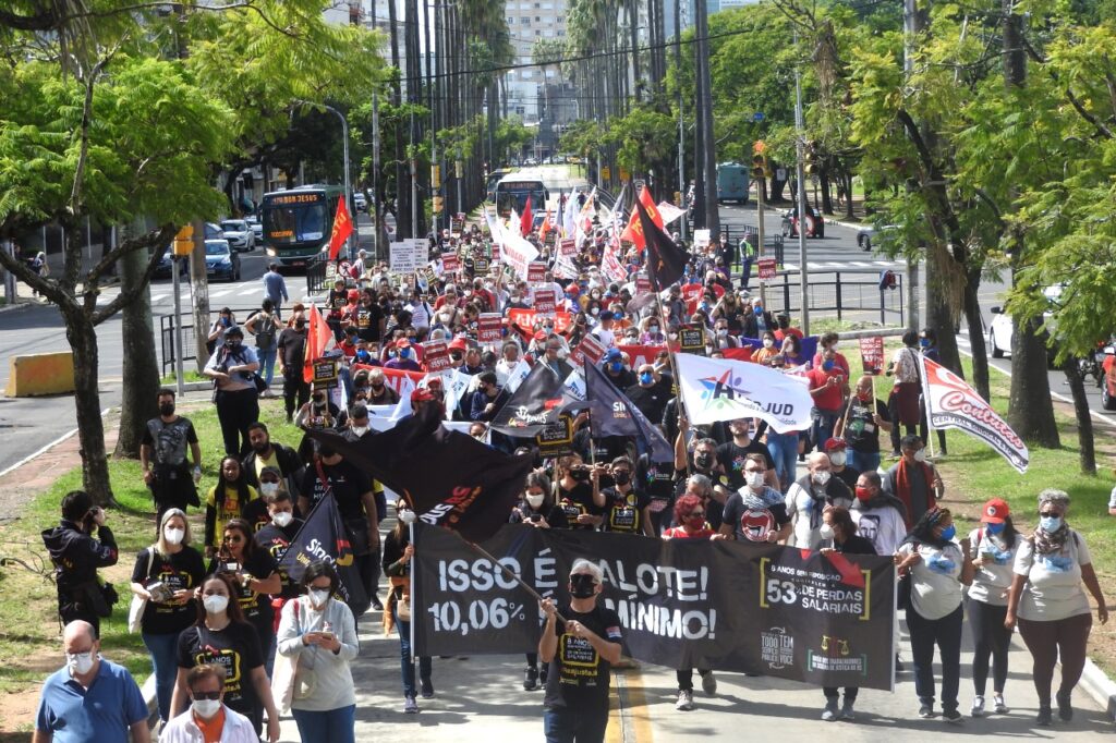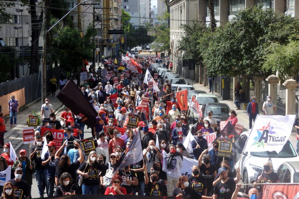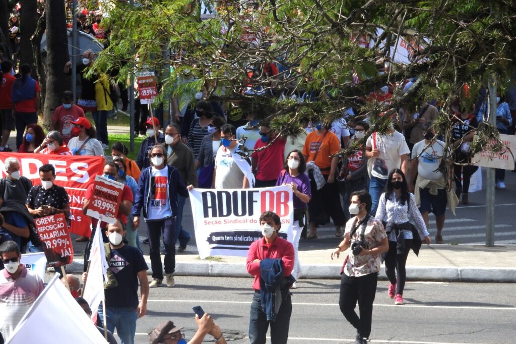 Durante o trajeto, que reuniu cerca de 2 mil pessoas, palavras de ordem foram entoadas pelo fim do governo Bolsonaro, em defesa da democracia, dos serviços públicos e dos direitos das trabalhadoras e dos trabalhadores. No carro de som, representantes das entidades chamavam atenção da população acerca da realidade vivida no país, de carestia e pobreza, com o aumento abusivo nos preços dos combustíveis e da alimentação.