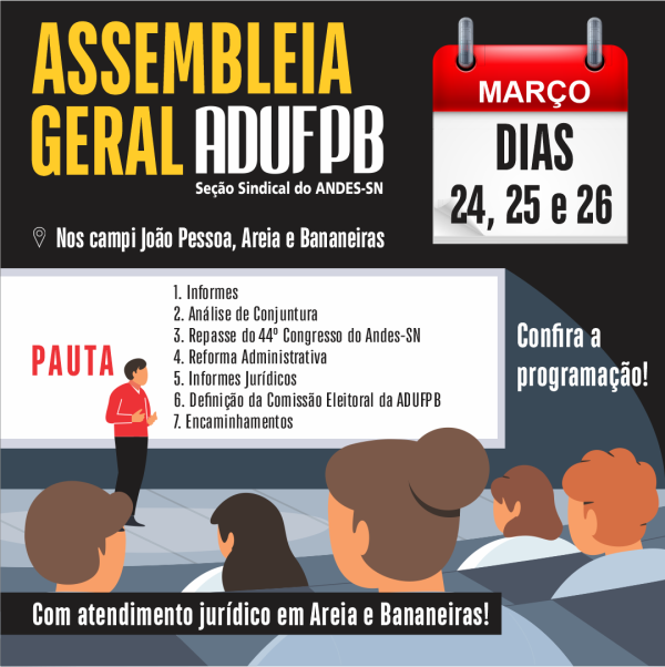 A ADUFPB convoca toda a categoria para uma nova rodada de assembleias na próxima semana. Os encontros serão realizados nos dias 24, 25 e 26, respectivamente nos campi de Bananeiras, João Pessoa e Areia. Entre os pontos de pauta, está a definição dos integrantes da Comissão Eleitoral do sindicato, que ficará responsável pela organização da eleição…