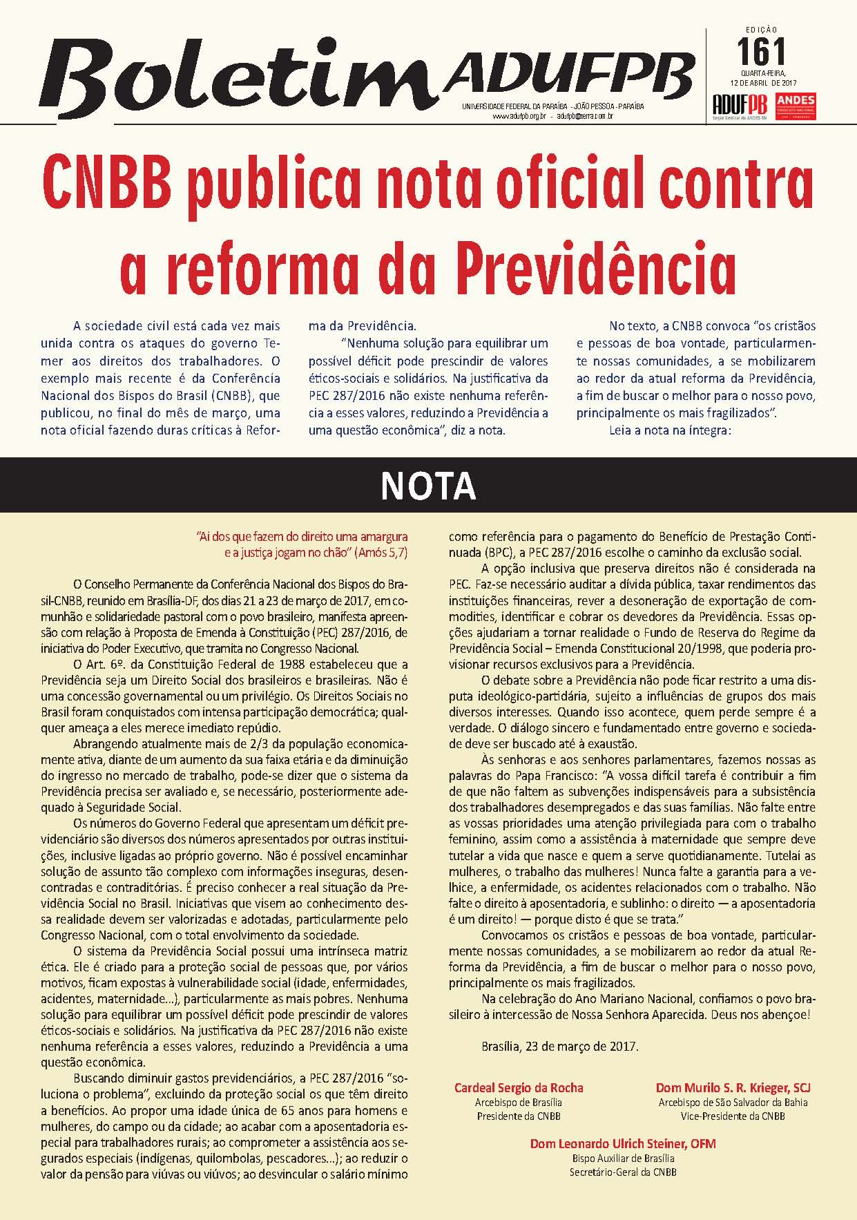 O Conselho Permanente da Conferência Nacional dos Bispos do Brasil-CNBB, reunido em Brasília-DF, dos dias 21 a 23 de março de 2017, em comunhão e solidariedade pastoral com o povo brasileiro, manifesta apreensão com relação à Proposta de Emenda à Constituição (PEC) 287/2016, de iniciativa do Poder Executivo, que tramita no Congresso Nacional.