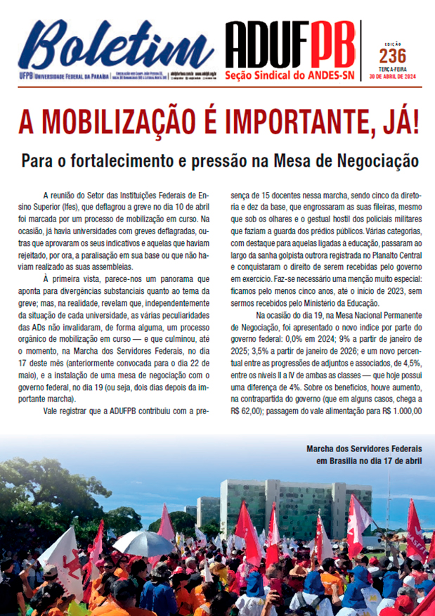 maio232024 Acesse a publicação. Versão PDF. 23 de maio de 2024 Compartilhar Compartilhar isto FacebookCompartilhar isto Facebook Share on XCompartilhar isto X Compartilhar isto WhatsAppCompartilhar isto WhatsApp Navegação de post:AnteriorPost anterior:Boletim ADUFPB | nº 235 | 26 ABRIL 2024 – AURORA DA DEMOCRACIAPróximoPróximo post:Boletim ADUFPB | nº 237 | 23 MAIO 2024 – AVALIAÇÃO ÚLTIMA PROPOSTA DO GOVERNO