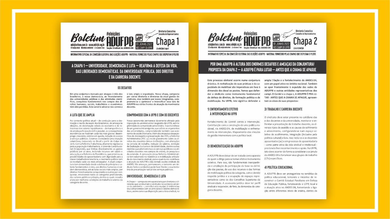 O texto do boletim é de responsabilidade das chapas concorrentes e a diagramação do material foi realizada pela Assessoria de Comunicação da ADUFPB.