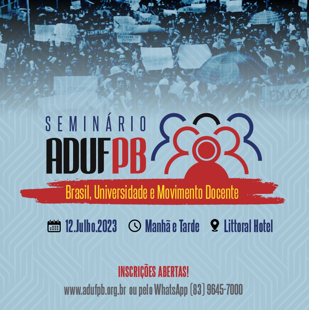 Nesta quarta-feira (12), a ADUFPB realiza o seminário Brasil, Universidade e Movimento Docente. Em pauta, os desafios e perspectivas para o ensino público superior no atual contexto político e as questões mais relevantes em torno do movimento docente e sua relação com as universidades. O evento acontece no Littoral Hotel, bairro Cabo Branco, com abertura programada para as 9h. Depois das mesas-redondas, que ocorrem nos turnos da manhã e da tarde, o encerramento será na Sede Sociocultural do sindicato (a 150 metros do hotel), com uma apresentação de Cecília Albuquerque — Voz & Violão, a partir das 18h30.