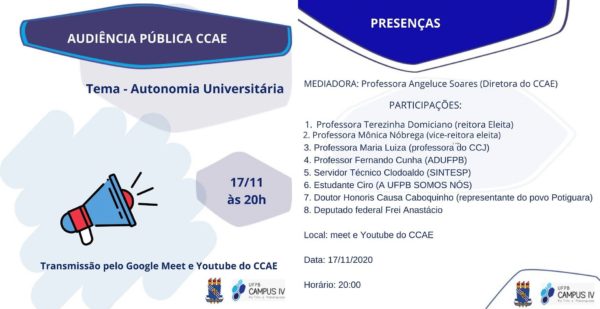 Os três segmentos que formam a UFPB vão estar unidos nesta quarta-feira (18/11) em defesa da autonomia universitária e contra a intervenção, na instituição, de um reitor não eleito. Professores, servidores técnico-administrativos e estudantes irão realizar um grande ato público para protestar contra o ataque do presidente Jair Bolsonaro, que ignorou a vontade popular expressa…