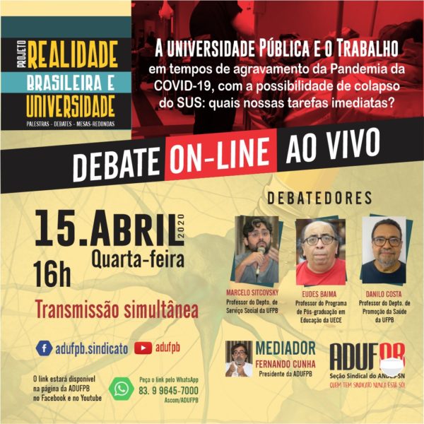 A pandemia causada pelo novo coronavírus e as ações necessárias para o enfrentamento dessa crise serão temas da próxima edição do Projeto Realidade Brasileira e Universidade, organizado pela ADUFPB. Por causa das medidas de isolamento social, o evento pela primeira vez será realizado em formato online, com transmissão ao vivo pelo Facebook e pelo YouTube.…