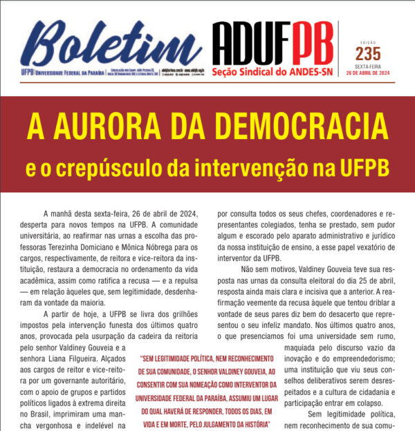 Professoras e professores da UFPB votaram pela manutenção do indicativo de greve sem data definida. A deliberação veio no final da tarde dessa terça-feira (30), como resultado da assembleia de base que reuniu a categoria nos quatro campi da universidade e contou com a participação de cerca de 200 docentes. No dia 5 de junho…