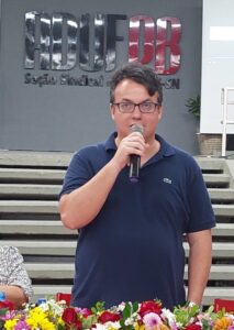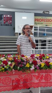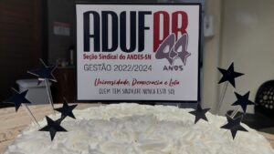 O ex-presidente da ADUFPB, Fernando Cunha, presidiu a mesa da solenidade e fez uma prestação de contas das inúmeras ações e atividades realizadas entre fevereiro de 2020 e junho de 2022. Além disso, ele fez questão de prestar homenagem às funcionárias e aos funcionários da ADUFPB e destacou que eles são parte fundamental na construção do sindicato nesses 43 anos de luta. O ex-presidente também saudou todas as diretoras e todos os diretores que atuaram na gestão anterior e lembrou importantes perdas que o sindicato sofreu nesses dois anos e meio: a morte da diretora de Política Social da entidade, Terezinha Diniz, e dos funcionários Marcelo Barbosa e Valdete Cavalcante.