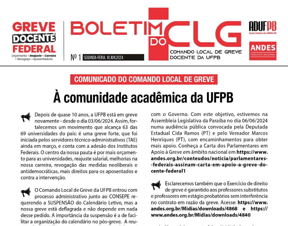 📣 Depois de quase 10 anos, a UFPB está em greve novamente – desde o dia 03/06/2024. Assim, fortalecemos um movimento que alcança 63 das 69 universidades do país: é uma greve forte, que foi iniciada pelos servidores técnico-administrativos (TAE) ainda em março, e conta com a adesão dos Institutos Federais. O centro da nossa pauta é por mais orçamento para as universidades, reajuste salarial, melhorias na nossa carreira, revogação das medidas neoliberais e antidemocráticas, mais direitos para os aposentados e contra a intervenção.