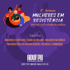 Ainda na sexta-feira, a ADUFPB divulgará a programação da próxima semana, quando o evento se encerra. Junte-se às Mulheres em Resistência! Participe do ato, visite a tenda da ADUFPB no Festival Político Cultural Pela Vida das Mulheres, dê quórum às discussões e engaje-se nas demais atividades da IV Semana Mulheres em Resistência da ADUFPB!