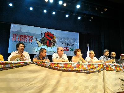 Saulo Arcangeli, representante da CSP-Conlutas, iniciou sua intervenção lembrando o papel do ANDES-SN como referência das lutas populares e da defesa da educação pública. “Durante os treze anos de governo de frente popular, o ANDES-SN encabeçou a luta contra as medidas de desvio de dinheiro público para a educação privada, em programas como o Prouni, o Fies e o Pronatec. Durante o ano passado, o Sindicato Nacional teve papel fundamental na luta contra o ajuste fiscal, realizando manifestações contra a PEC 55 em conjunto com estudantes que ocupavam suas escolas, institutos e universidades”, afirmou o sindicalista, que ressaltou a necessidade da construção de uma grande Greve Geral para barrar os ataques.