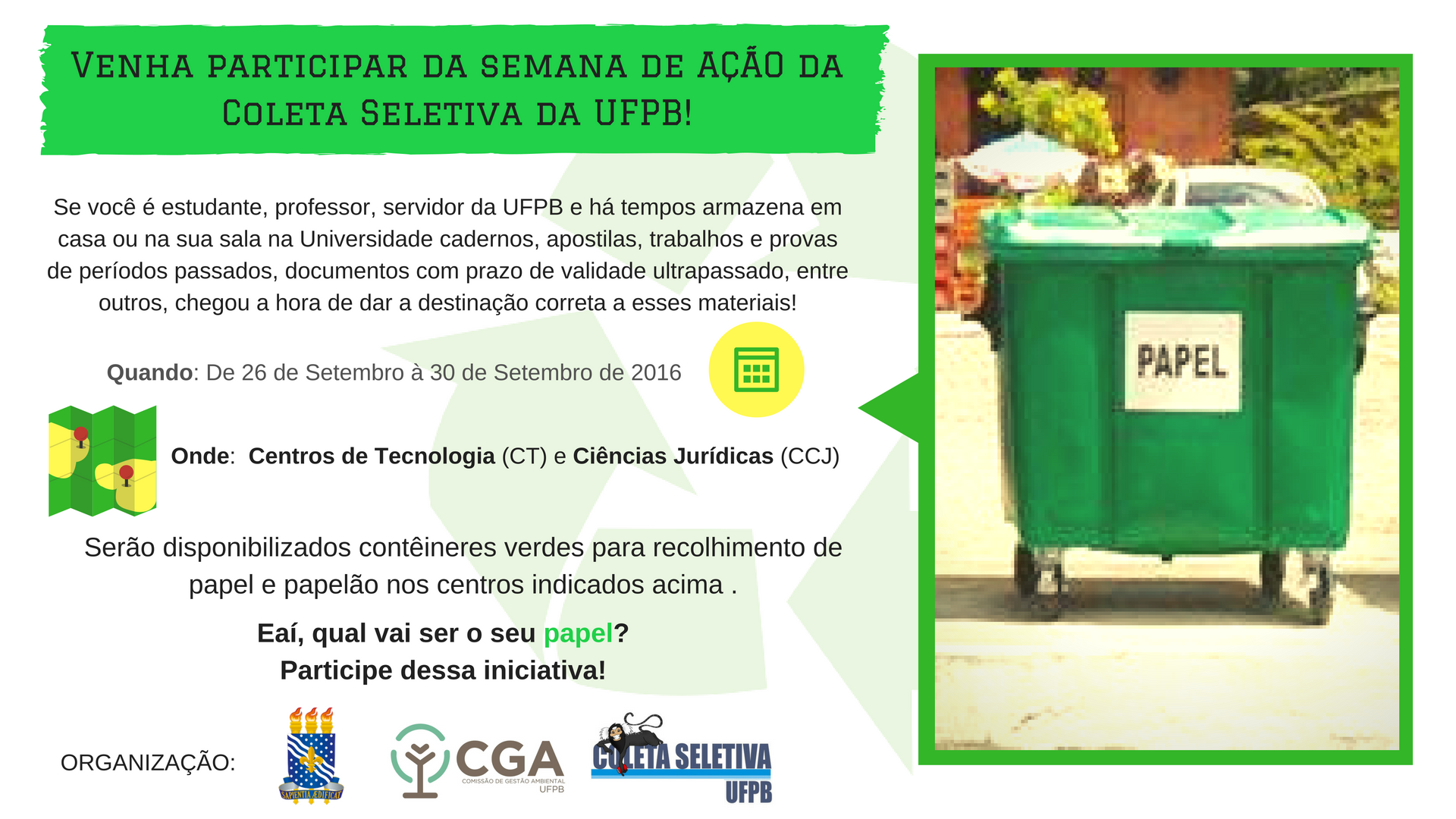 Começou nesta segunda-feira (26/9) a Semana de Ação da Coleta Seletiva no campus I da Universidade Federal da Paraíba. A atividade é realizada pelo Projeto da Coleta Seletiva integrante da Comissão de Gestão Ambiental da instituição e segue até sexta-feira, 30 de setembro.