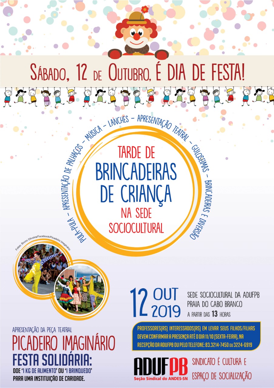 Para comemorar o Dia das Crianças, a ADUFPB realiza no próximo sábado (12/10), a partir das 13h, uma festa com muitas brincadeiras, música e diversão. A atividade ocorrerá na sede sociocultural, localizada na rua Gilvan Muribeca, n. 88, no Cabo Branco, e contará com pula-pula e distribuição de lanches. A principal atração do dia será o espetáculo circense e musical “Picadeiro Imaginário”, do Grupo de Teatro Engenho Imaginário.