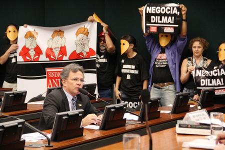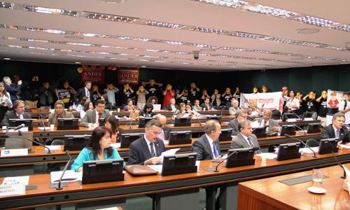 Por solicitação do CNG do ANDES-SN, o deputado Newton Lima (PT-SP), convidou os docentes a participarem da reunião ordinária da Comissão de Educação da Câmara dos Deputados nesta quarta-feira (22). O Comando de Greve dos Professores e dos Estudantes marcaram presença na reunião, carregando faixas e cartazes exigindo a reabertura de negociação e criticando a postura intransigente da Presidente Dilma Rousseff frente à greve no serviço público. Estiveram presentes também representantes da Fasubra, da Asfoc, entre outras entidades dos servidores públicos.