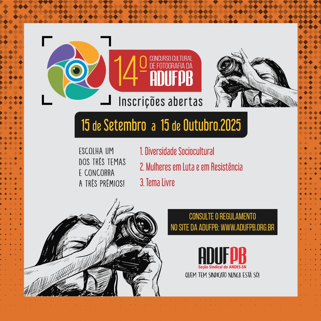 O Concurso Cultural de Fotografia da ADUFPB é uma iniciativa do sindicato que tem como objetivo incentivar e divulgar o talento artístico e a criatividade fotográfica dos(as) filiados(as). Como no ano passado, os(as) docentes poderão inscrever imagens dentro de três temas propostos: (1) Diversidade Sociocultural, (2) Mulheres em Luta e em Resistência e (3) Tema livre. Vale ressaltar que não é permitido inscrever-se em dois ou mais temas. O(a) docente pode enviar até três imagens, porém todas elas, obrigatoriamente, têm que ser referentes ao mesmo tema.