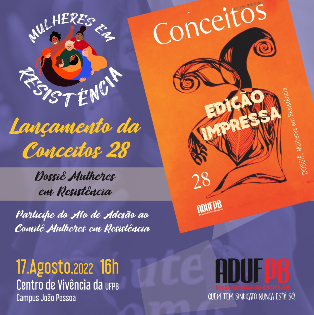 A edição especial da Revista Conceitos – Dossiê Mulheres em Resistência, editada pela ADUFPB, ganhou uma versão impressa, que será lançada na próxima quarta-feira (17/8). A apresentação e mediação do evento ficará por conta das organizadoras do dossiê, as professoras Sandra Luna, diretora de Comunicação, e Rita Porto, diretora de Assuntos de Aposentadoria da ADUFPB. O evento ocorrerá no Centro de Vivência do campus I, em João Pessoa, a partir das 16h, e contará com uma apresentação voz e violão da cantora Cida Alves.