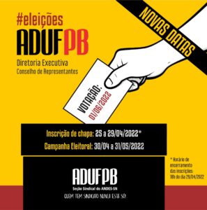 A comissão responsável por organizar as eleições da ADUFPB modificou os prazos referentes ao processo eleitoral 2022. As inscrições de chapa, que começariam nesta segunda-feira (18), agora terão início no dia 25 de abril, seguindo até as 18h do dia 29.