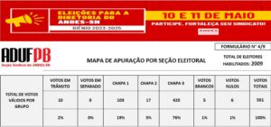 A Chapa 3 – “RENOVA ANDES”, uma das candidatas à escolha da nova diretoria do Andes – Sindicato Nacional, foi a que teve a melhor votação entre os docentes na Universidade Federal da Paraíba, com 420 votos, ou 76% do total. O resultado geral da eleição, no entanto, só será divulgado na terça-feira (16), e a proclamação final dos resultados acontecerá depois de encerrados todos os prazos de recursos.