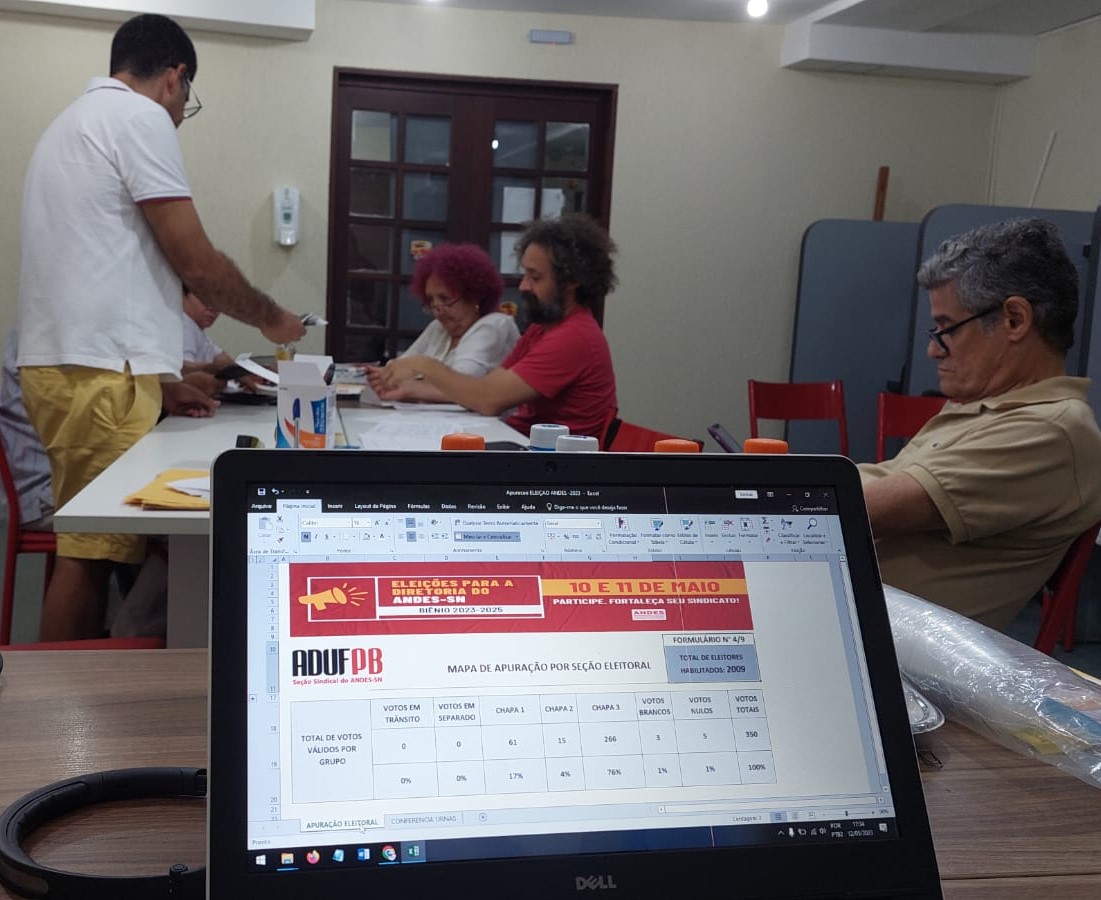 A apuração dos votos aconteceu a partir das 16h desta sexta-feira (12), na sede da ADUFPB, pelo canal da entidade no YouTube. Muitos professores acompanharam a contagem pelo aparelho televisivo instalado na sala principal do sindicato, que retransmitiu o canal.