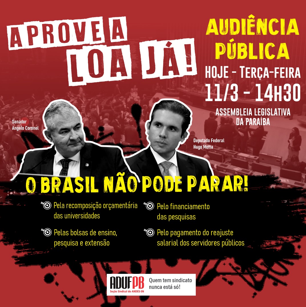 No período da tarde, representantes da Diretoria Executiva do sindicato participam de uma audiência pública da Comissão de Orçamento, Fiscalização Tributação e Transparência da Assembleia Legislativa da Paraíba para debater a LOA e seus impactos sobre os trabalhadores. A atividade – que será realizada no Plenário “Deputado José Mariz”, a partir das 14h30 – foi solicitada pela deputada Cida Ramos, que é professora licenciada do Departamento de Serviço Social da UFPB.