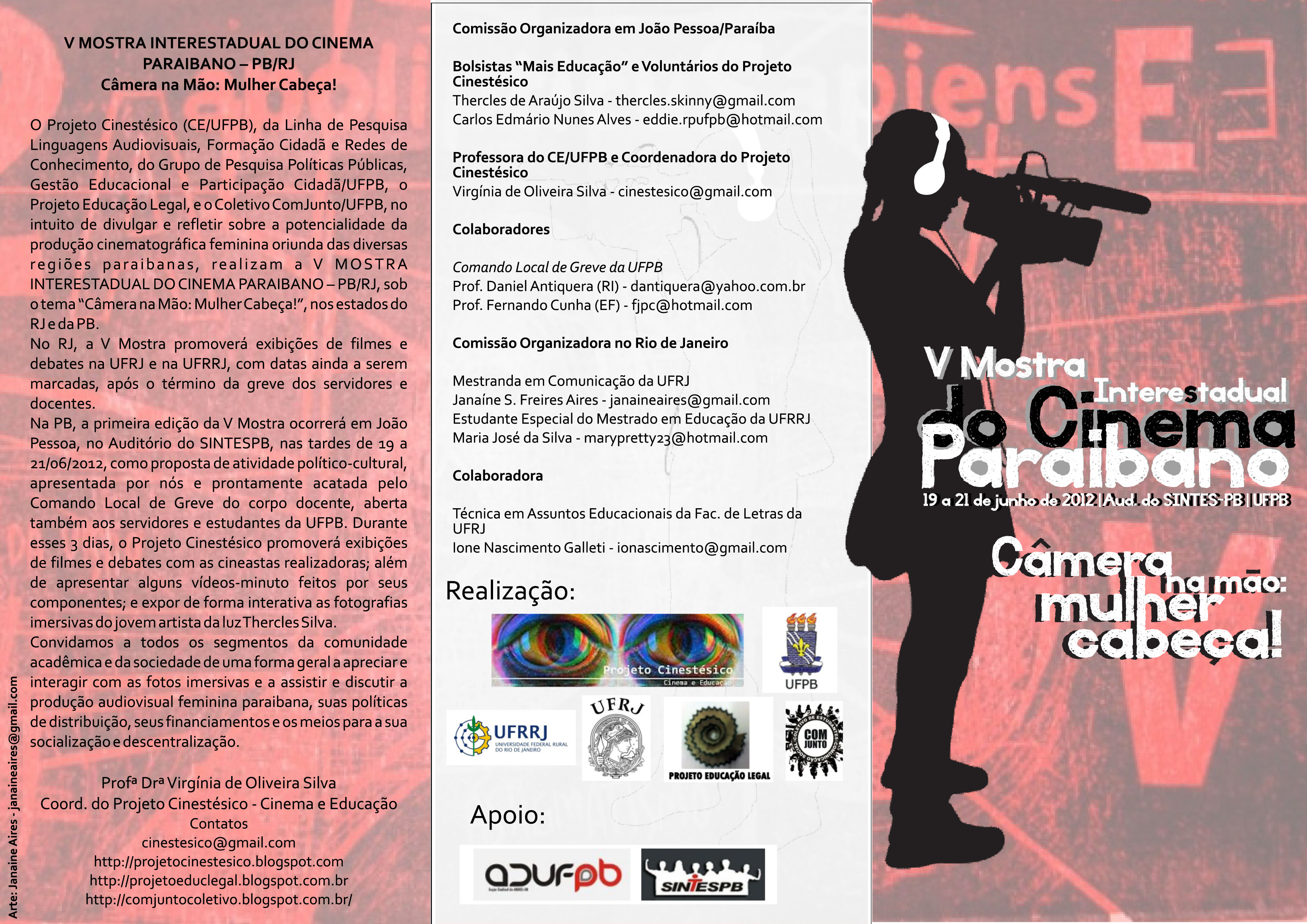 Esta quinta-feira (21) é o último dia da V Mostra Interestadual do Cinema Paraibano – PB-RJ – “Câmera na mão: Mulher cabeça!”, organizada pelo Projeto Cinestésico – Cinema e Educação, junto com o Projeto Educação Legal e o Coletivo Comjunto.